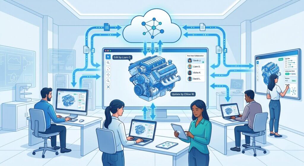 The platform is fundamentally a cloud-based data management system (replacing conventional PDM systems like SOLIDWORKS PDM), collaborative channels in real-time, and an expanding library of discipline-specific roles – modular applications to particular disciplines (structural analysis, system architecture, manufacturing planning, etc.).